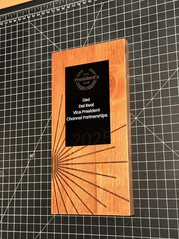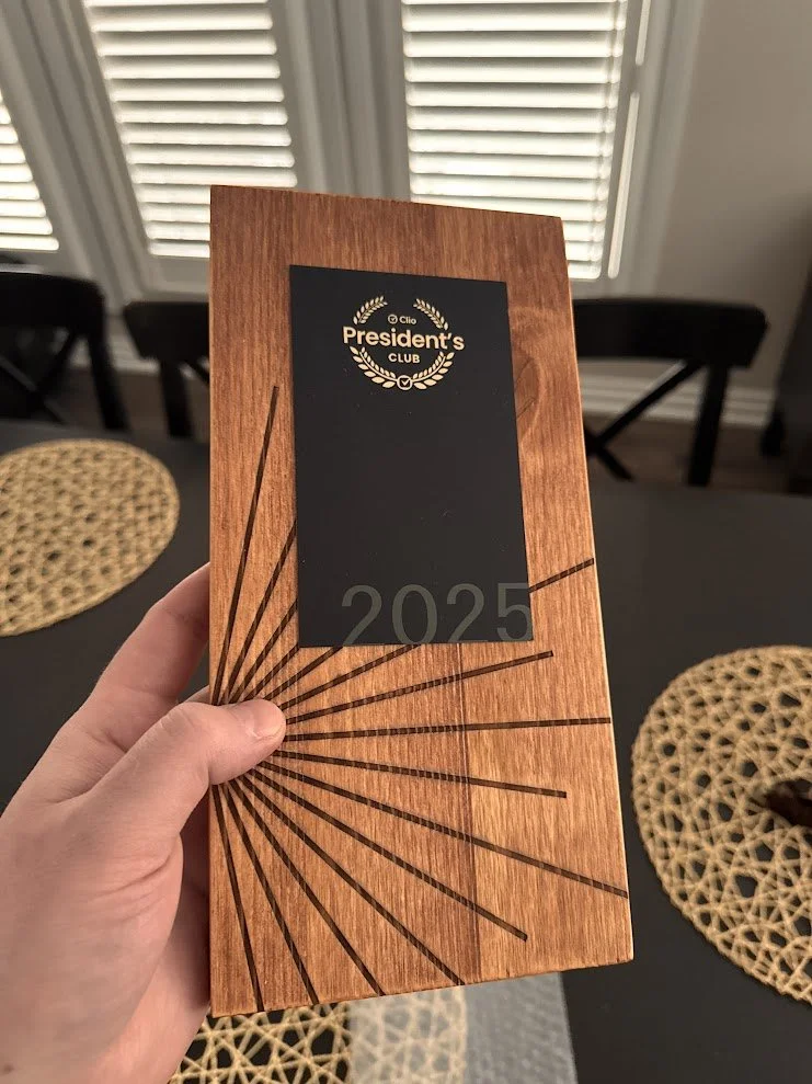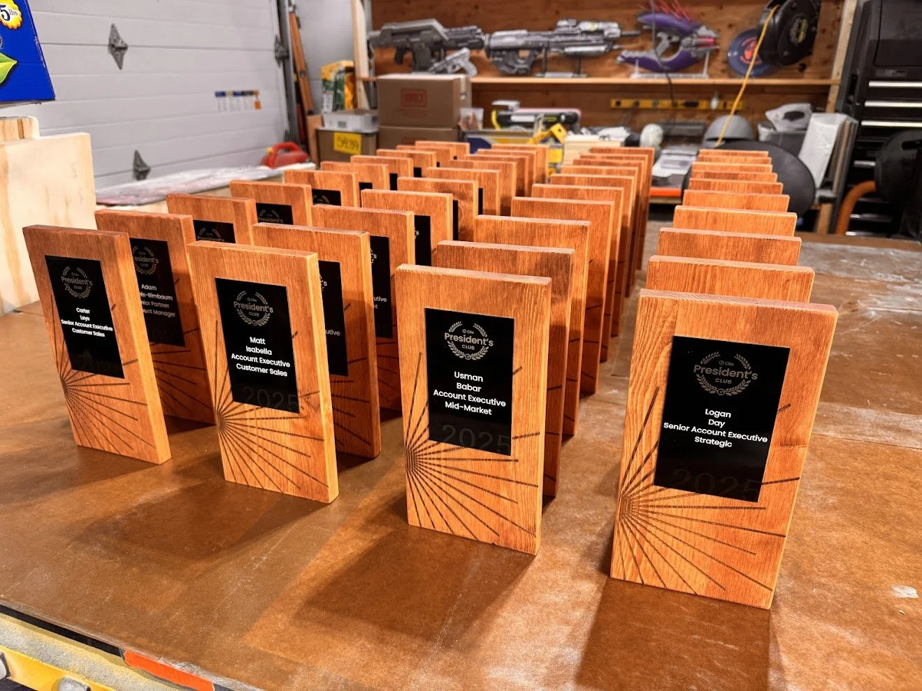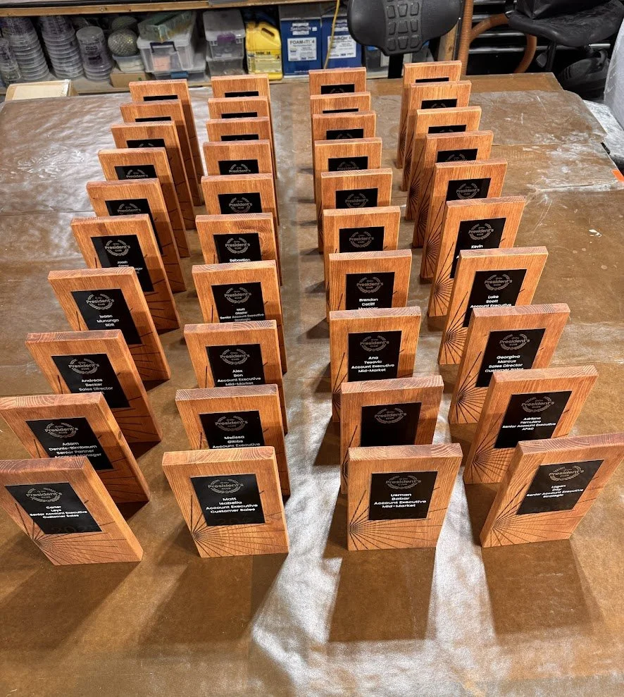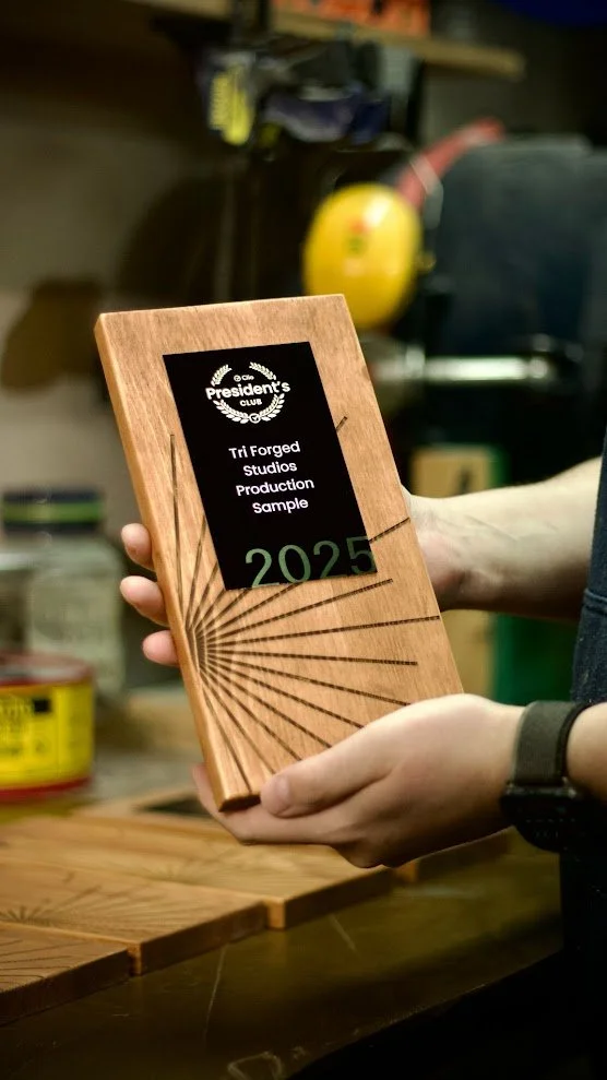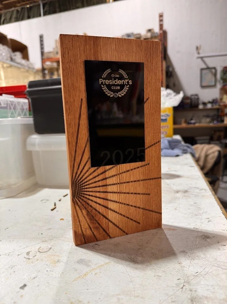 We were commissioned by Mosaic Canada to create 40 custom wooden trophy plaque awards for Clio’s President’s Awards. Each piece began as a finished pine board that was laser engraved and stained in a walnut tone to match the client’s colour direction.