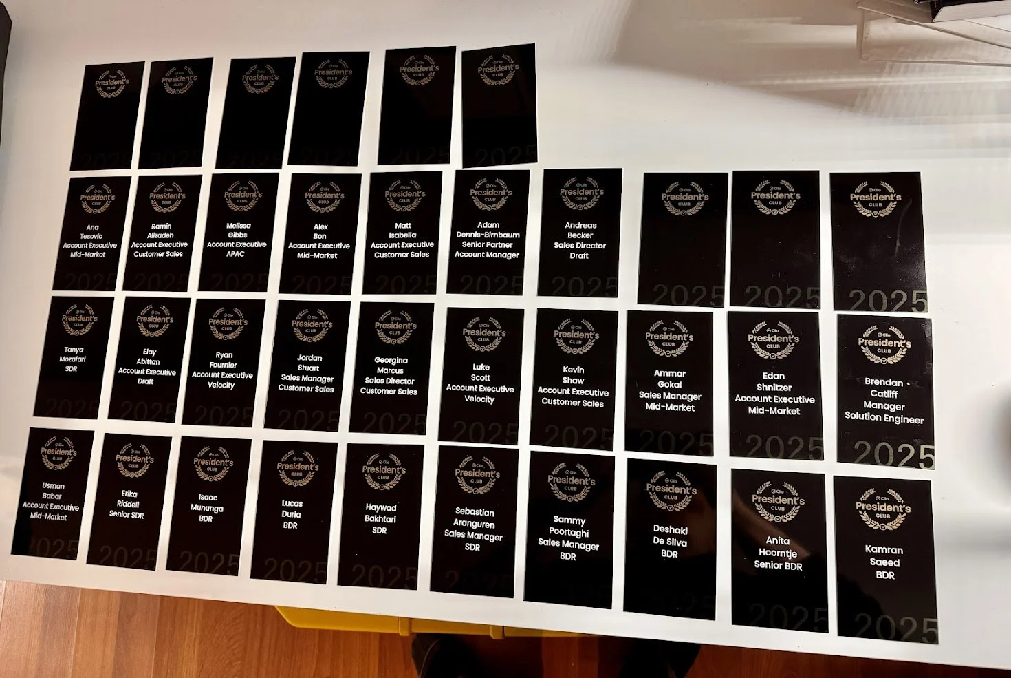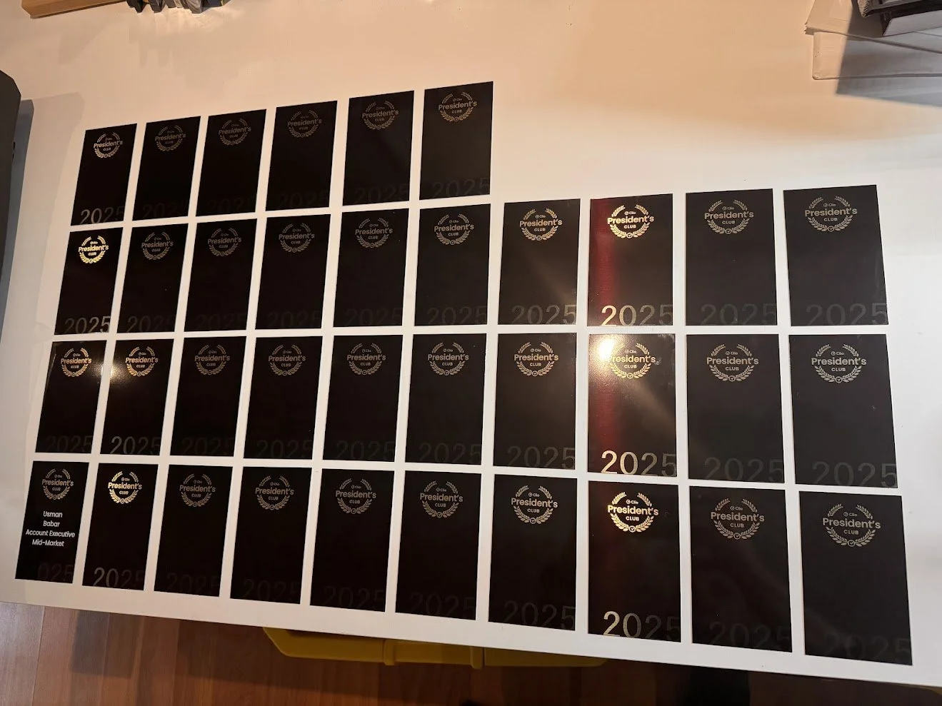 The plaque elements were produced on metal sublimated plates to introduce gold accents in the logo and a darker contrasting tone for the 2025 offset. Since the winners were announced very close to the delivery date, the individual names were applied using permanent vinyl to meet the tight timeline.