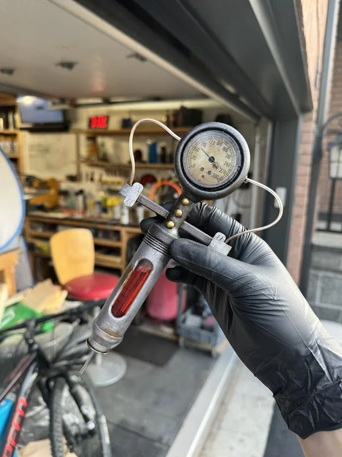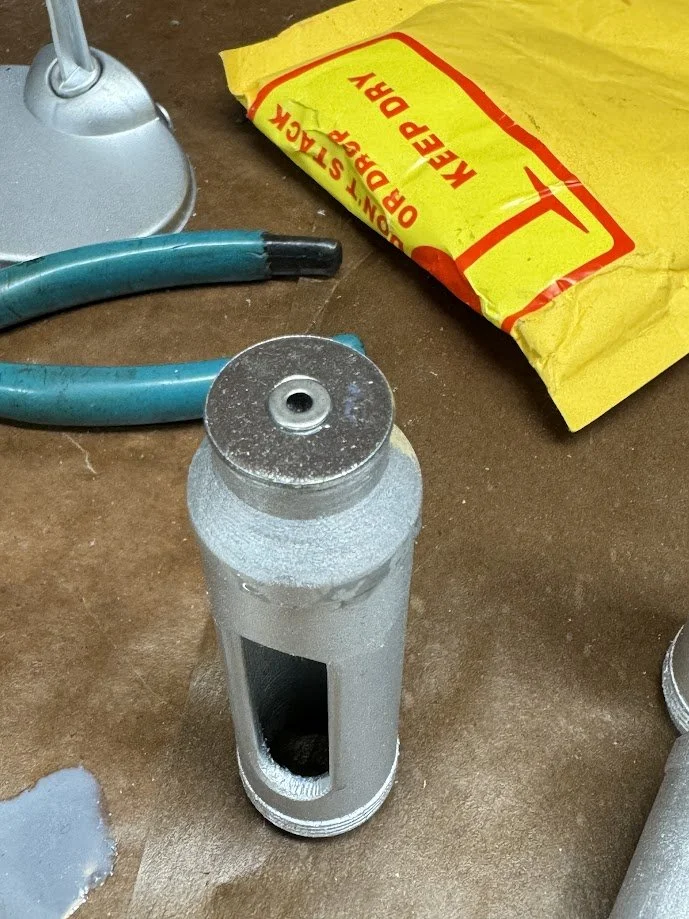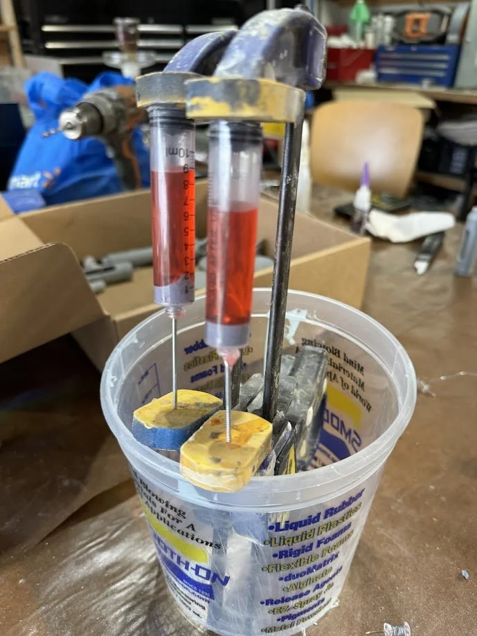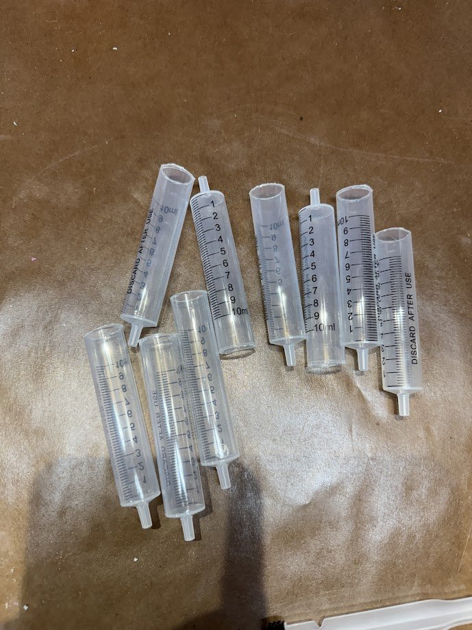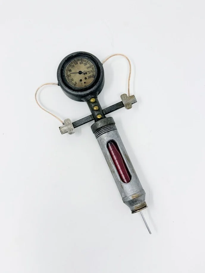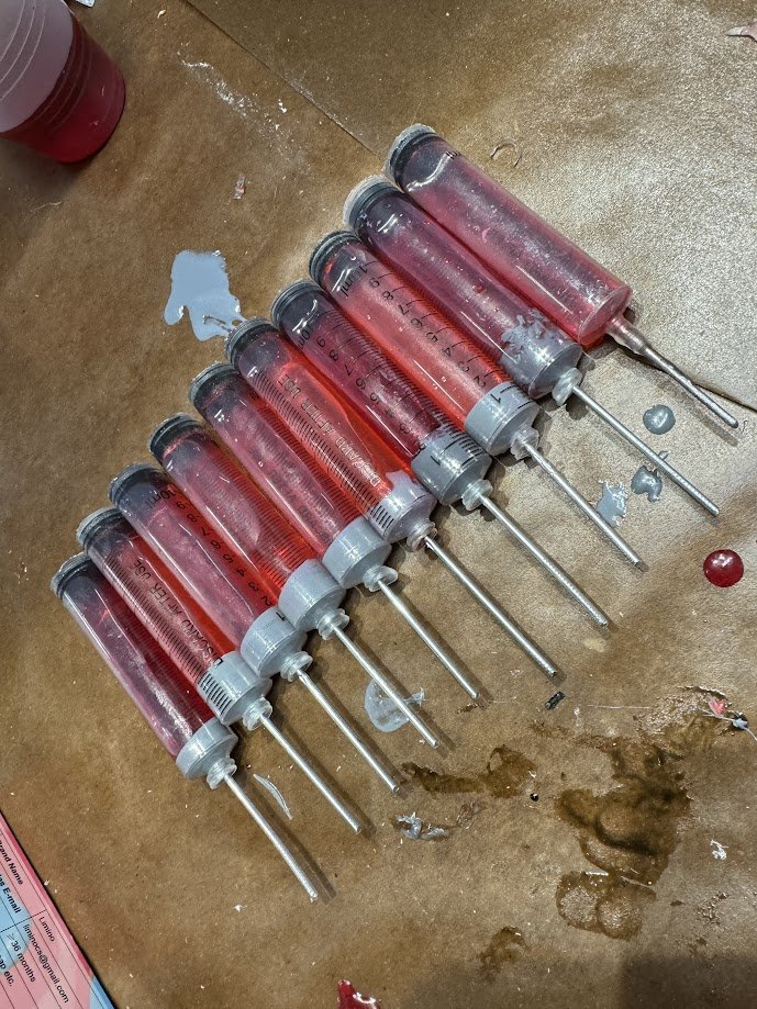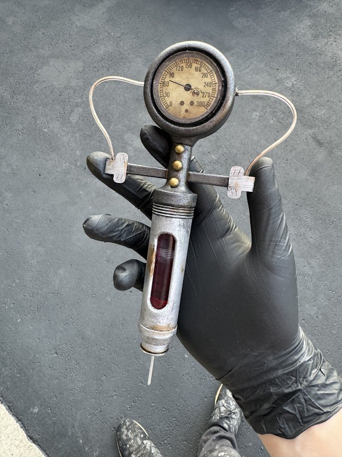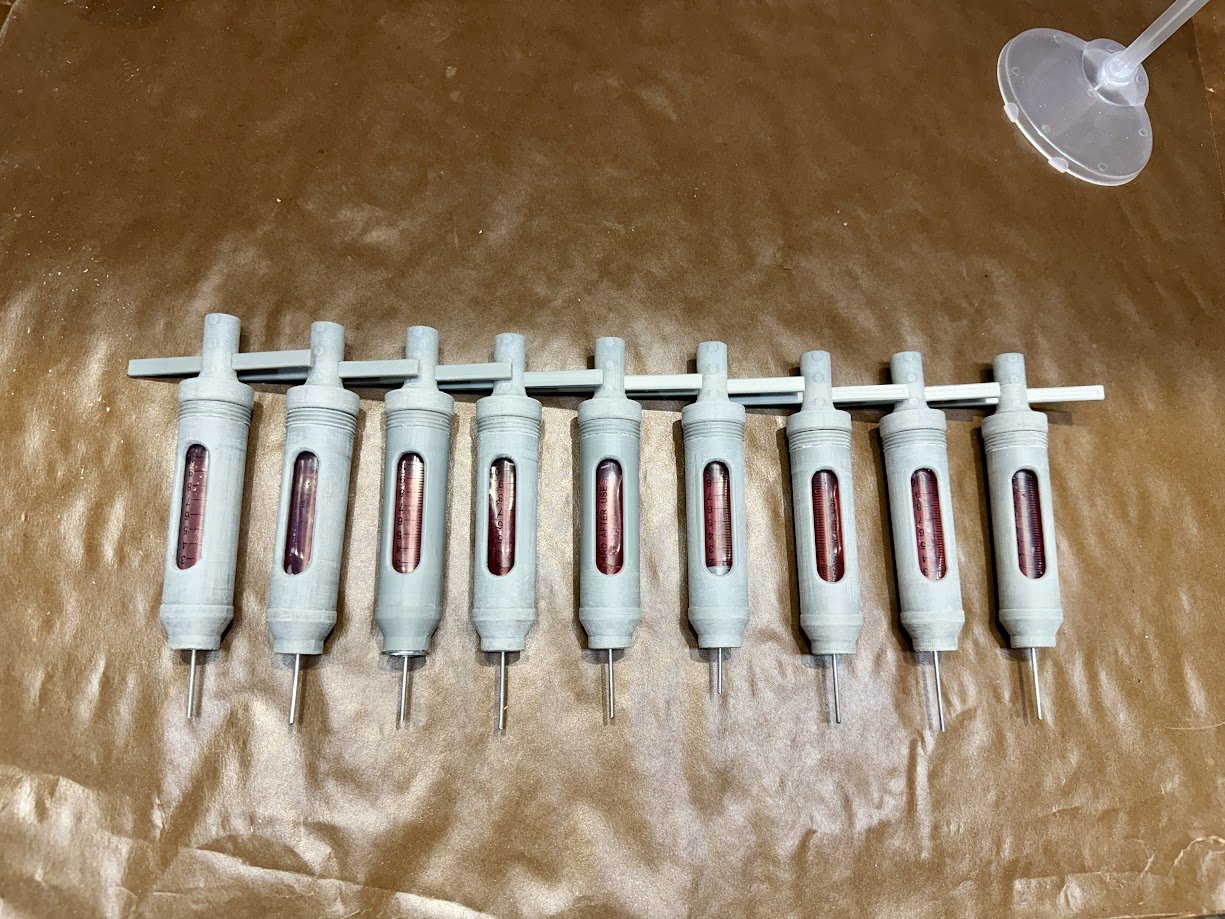 The original needle was 3D printed, but later replaced with the body of a metal rivet for better durability and appearance. Metal washers were added in several areas to build up surface detail. Resin was poured into the bottoms of each syringe to prevent leaks, and epoxy was used at the top to fully seal the assembly.