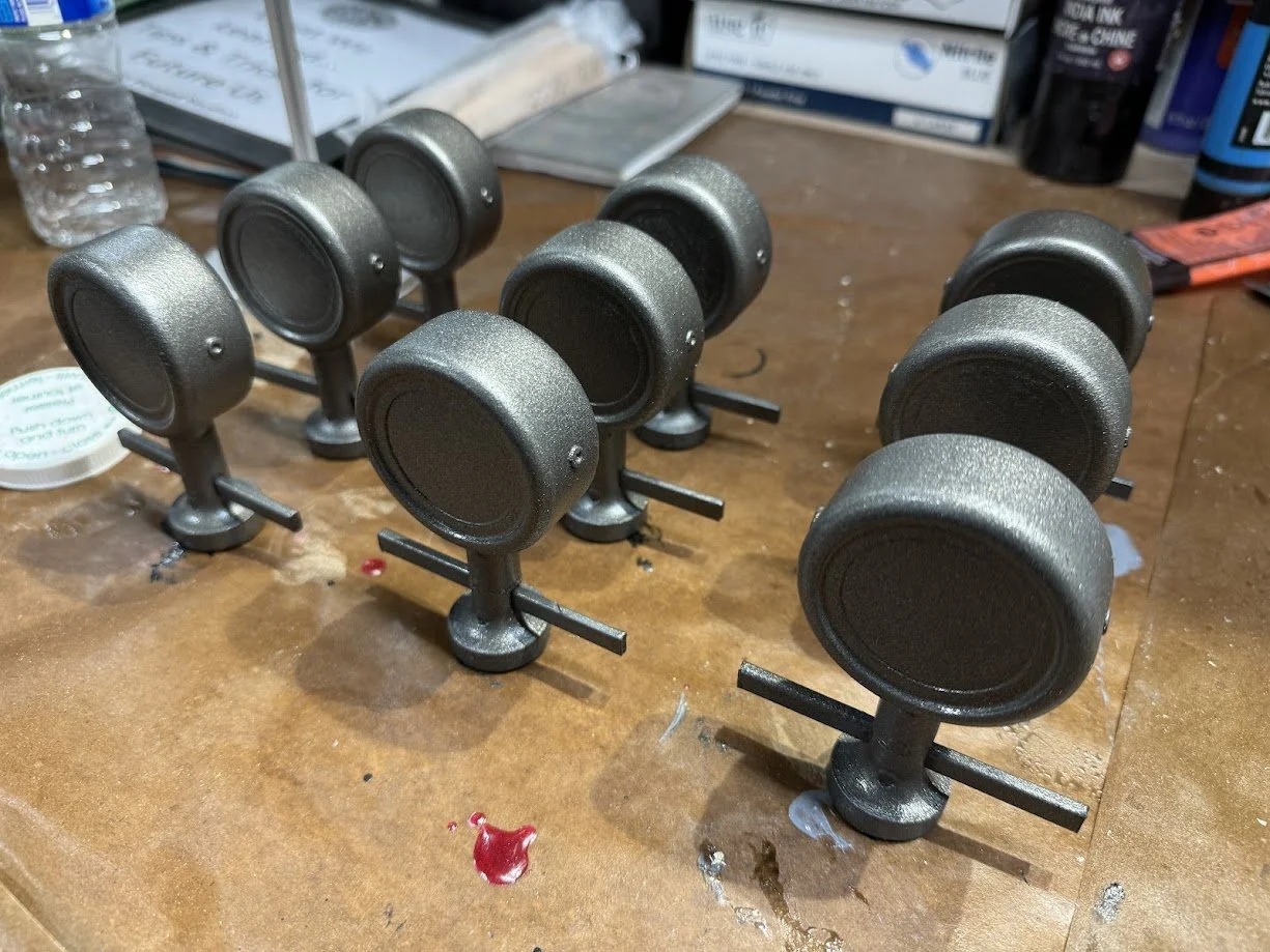 The finish used a mix of gunmetal, aluminum, and silver paints. Rust effects were added using layered inks and paints to vary the surface tones. Brass pins were heated and pressed into the front section for additional detail.