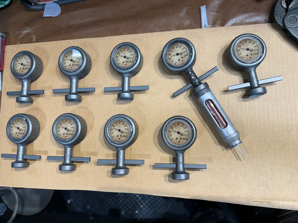 The gauge graphic was printed in vinyl and backed with a clear acrylic lens. A display stand was added near the end of the project to support the prop and improve presentation.
