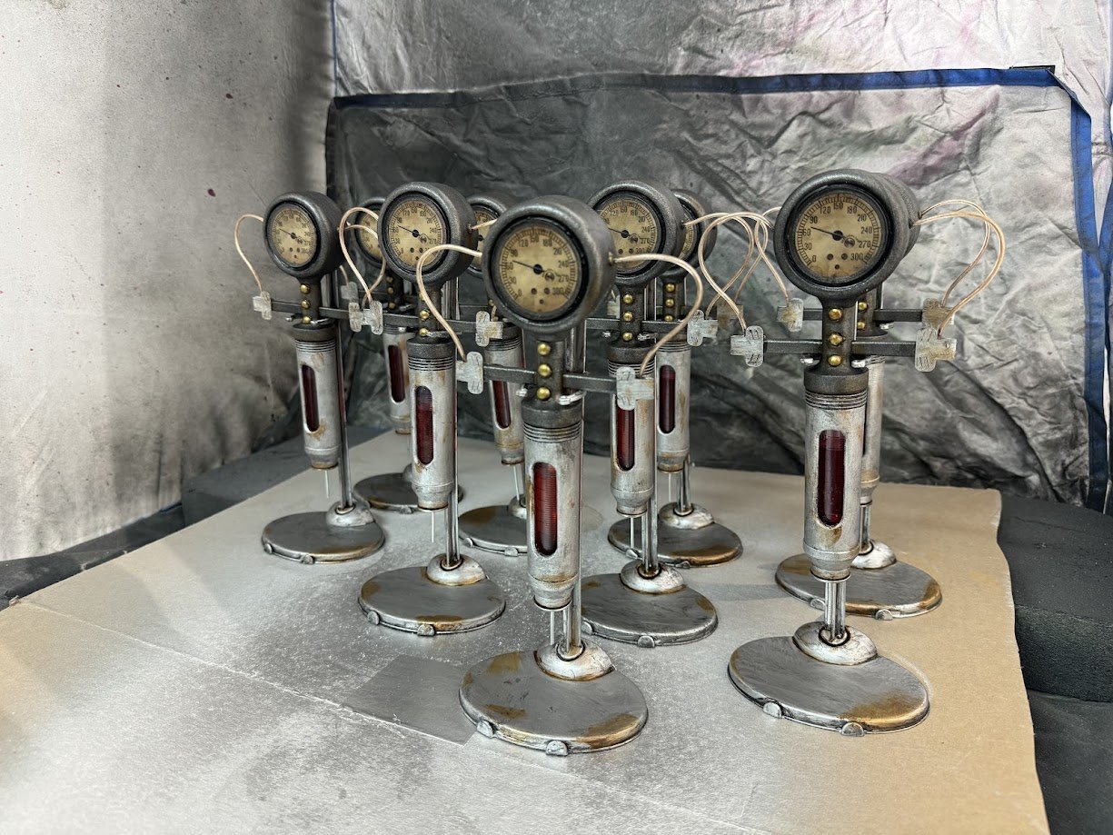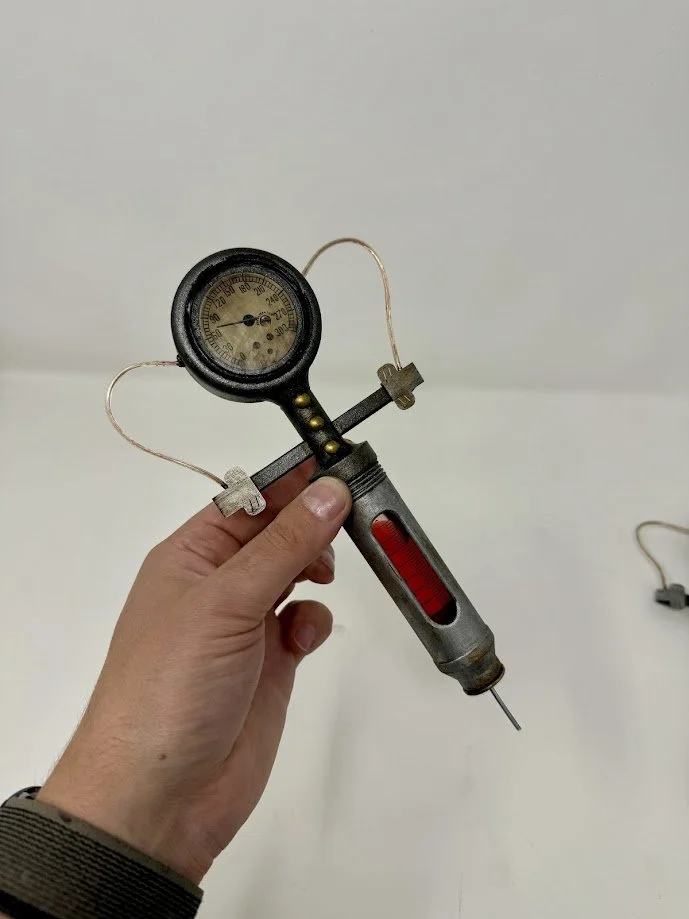 The prop was designed to be FDM printed in multiple parts with minimal supports to reduce cleanup time. One of the goals was to include red liquid inside the syringes so it could move and slosh for a more realistic effect. The gauge and exposed wiring were also key details in the build.