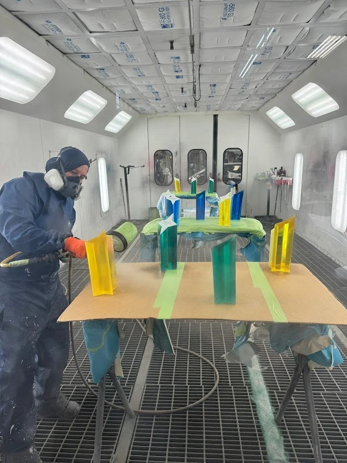 The white tops required an especially delicate process: they were painted matte white with removable vinyl applied for the design. Removing the vinyl was a challenge—if the paint peeled, the entire piece had to be resanded and redone. After a few trials, we perfected the process to ensure consistency across the full run.