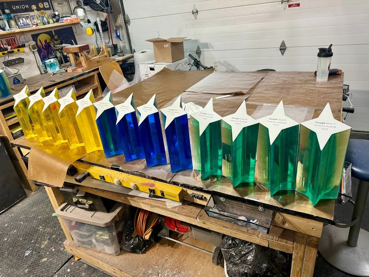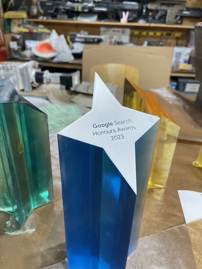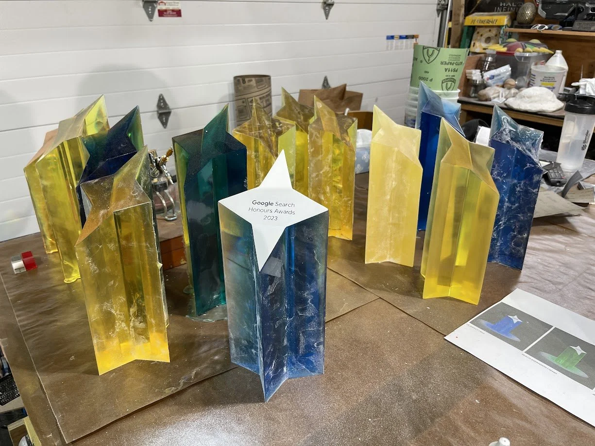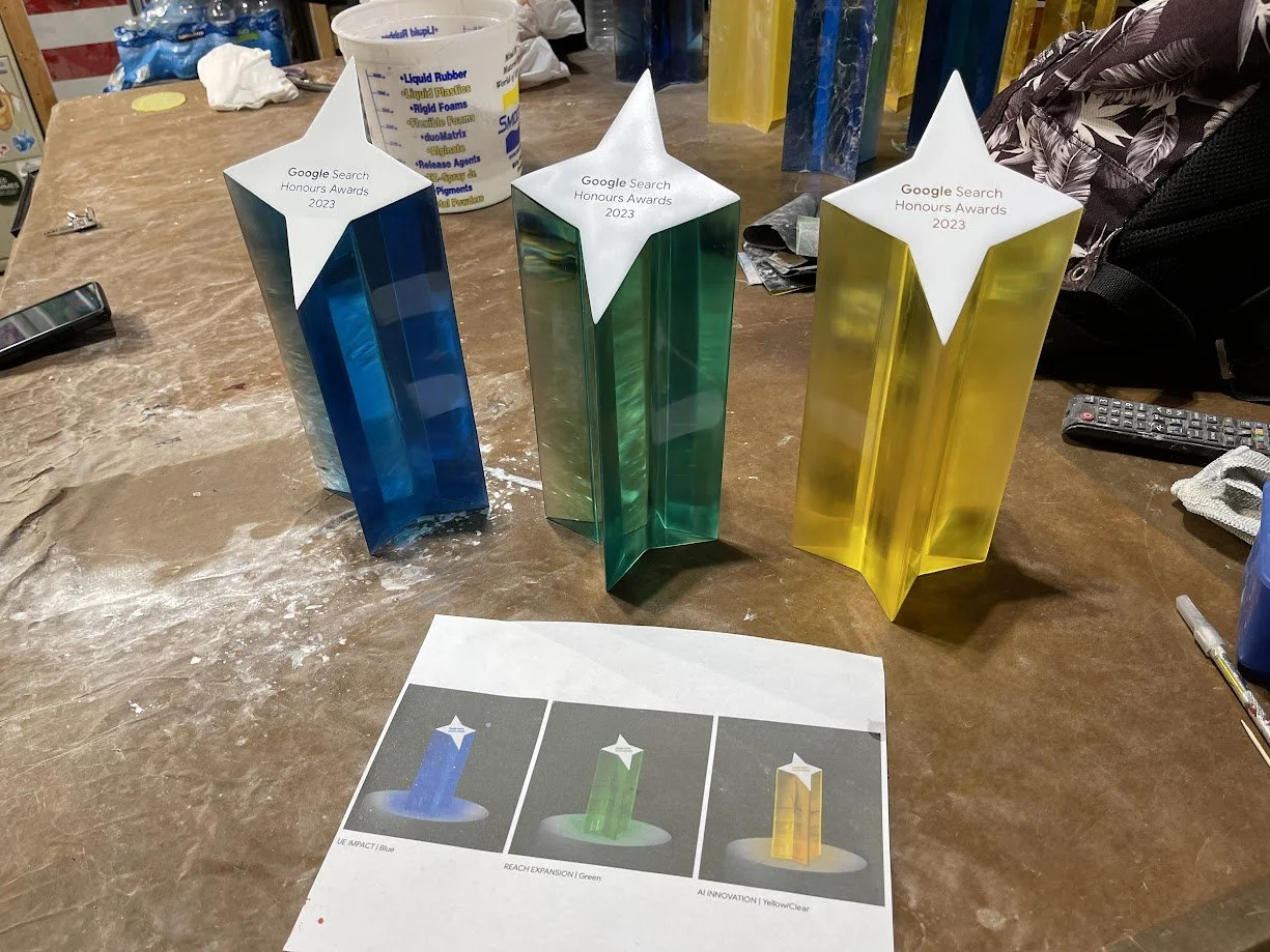 To match Google’s brand colours, we ran multiple dye tests until we achieved the exact tones from the provided renders. After casting, every trophy was meticulously wet-sanded by hand, progressing from 220 grit all the way to 2000 grit, before receiving a durable 2K automotive clear coat at a professional paint shop for a sleek, high-gloss finish.