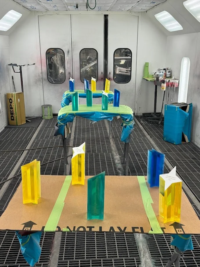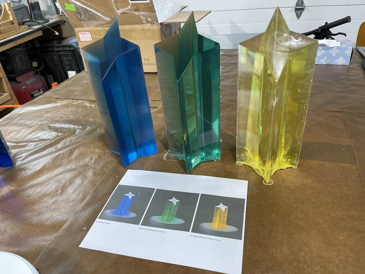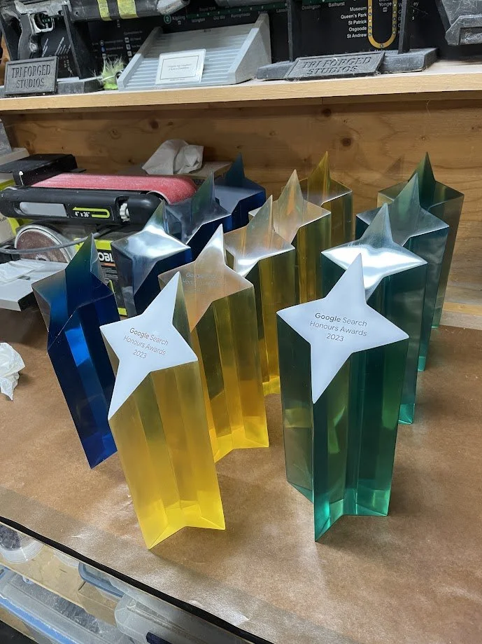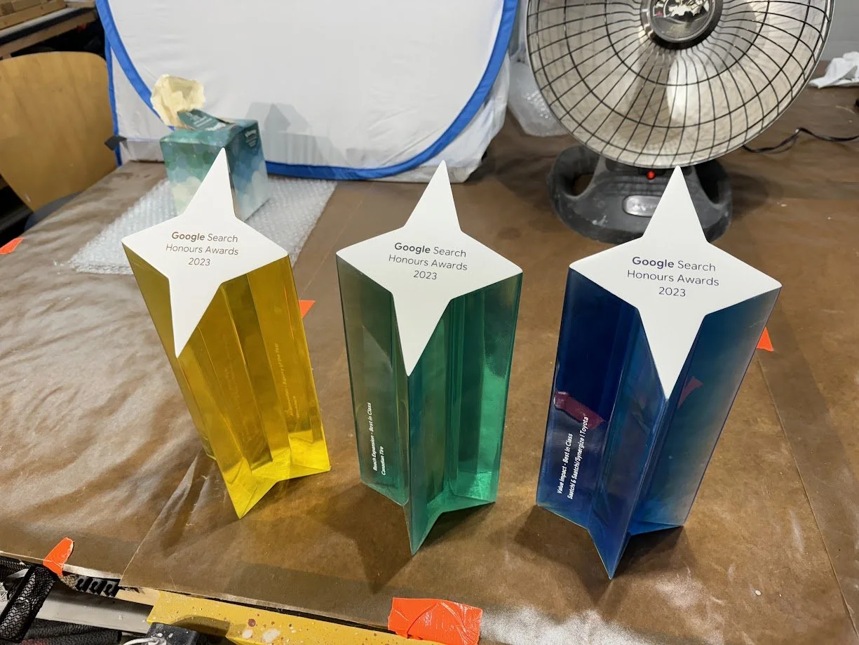 To match Google’s brand colours, we ran multiple dye tests until we achieved the exact tones from the provided renders. After casting, every trophy was meticulously wet-sanded by hand, progressing from 220 grit all the way to 2000 grit, before receiving a durable 2K automotive clear coat at a professional paint shop for a sleek, high-gloss finish.
