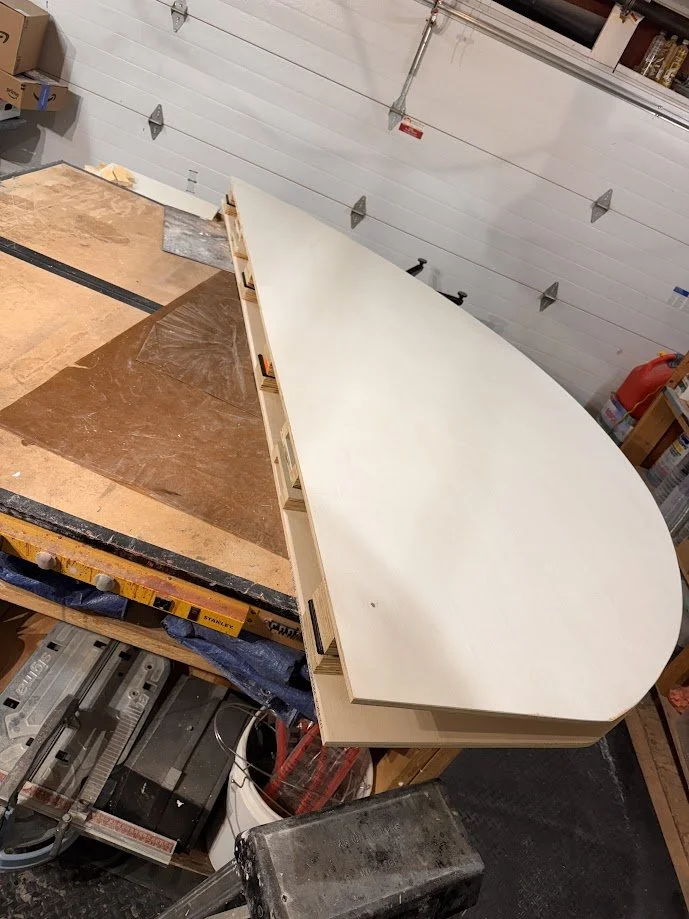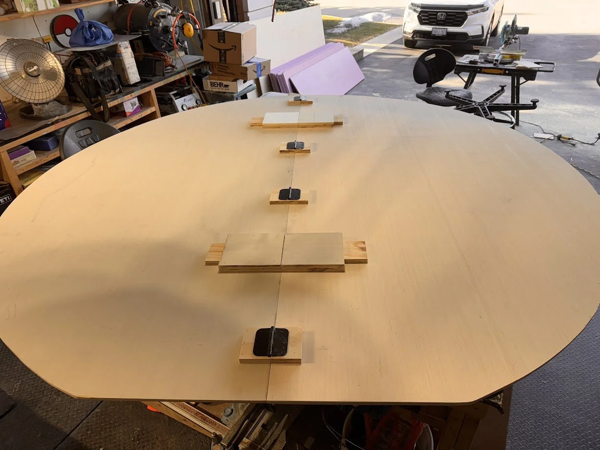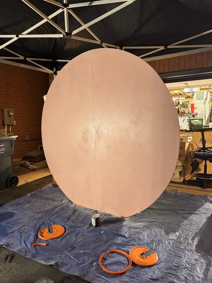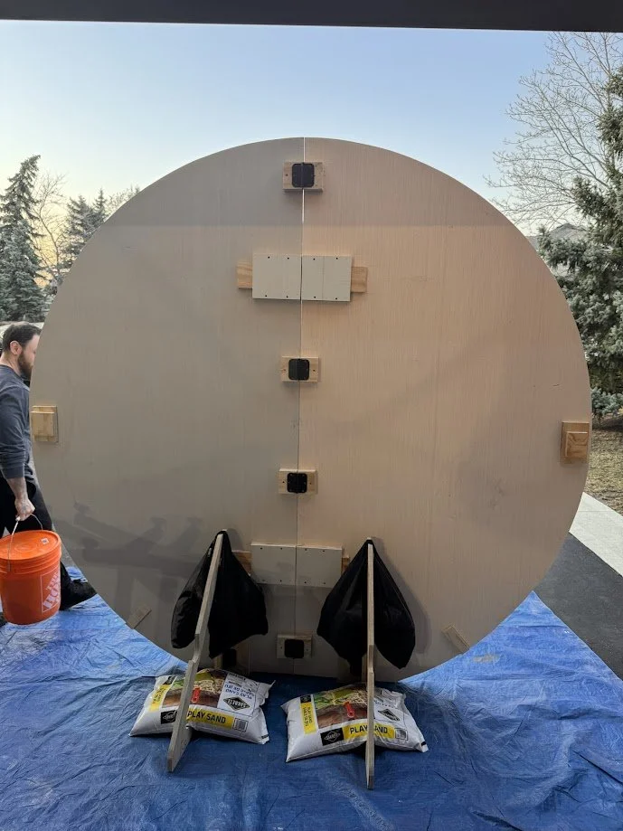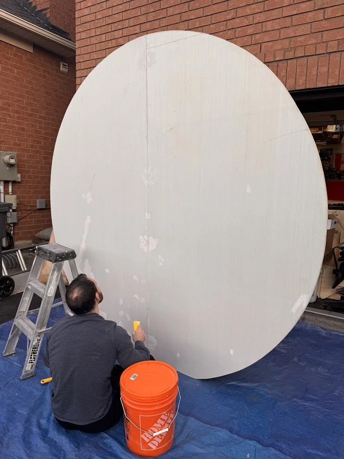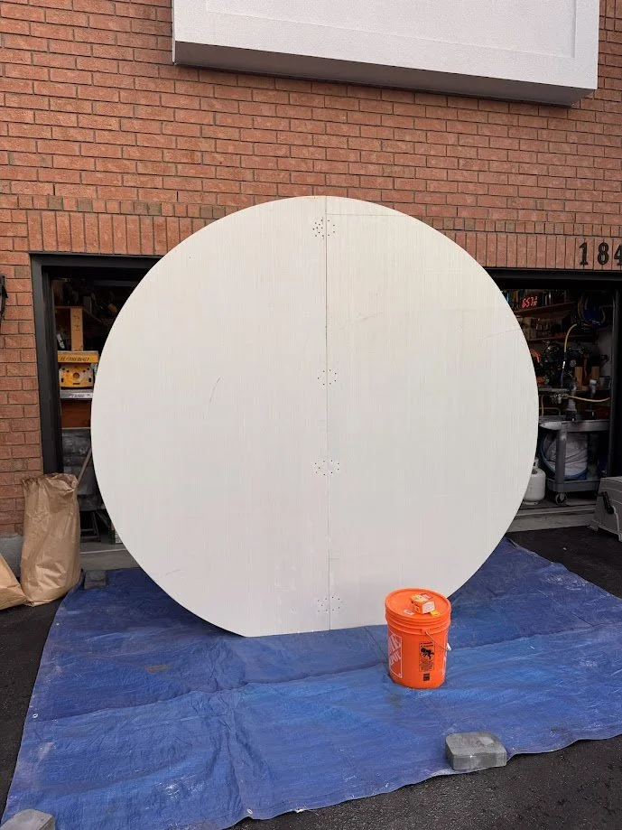 The backdrop stood 8 feet tall and was built from ½” primed plywood to provide a smooth, paint-ready surface. For transport and storage, we designed it in two hinged sections that could fold in half. Solid pine boards were used for the legs, giving the structure strength and stability.