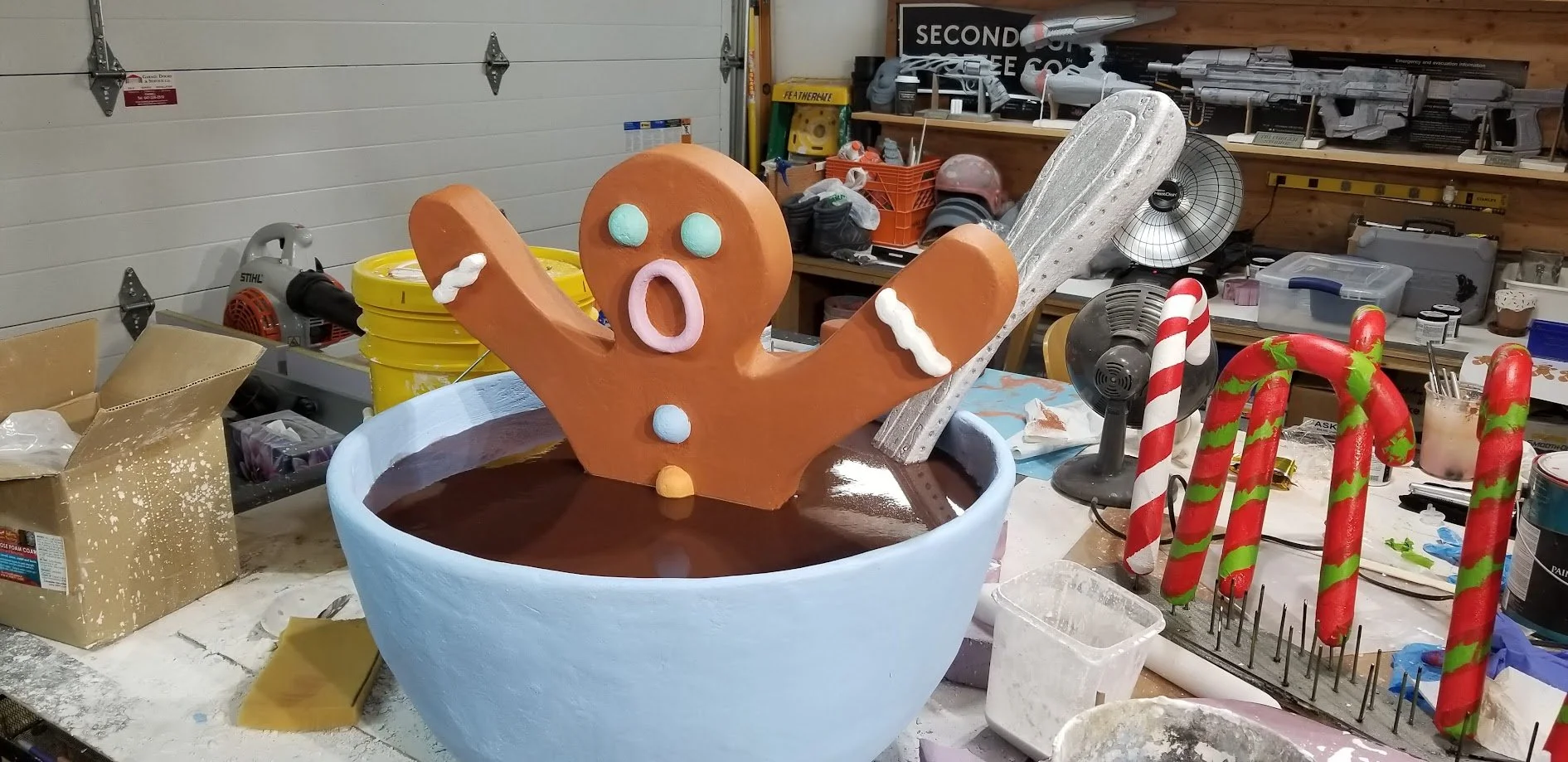 One standout piece was a gingerbread sitting inside a giant hot chocolate cup. The cup itself was carved from XPS foam, hard-coated, and painted blue with white snowflake accents. The “hot chocolate” was made using clear platinum silicone dyed brown, which gave it the reflective qualities of real liquid without relying on painted effects.