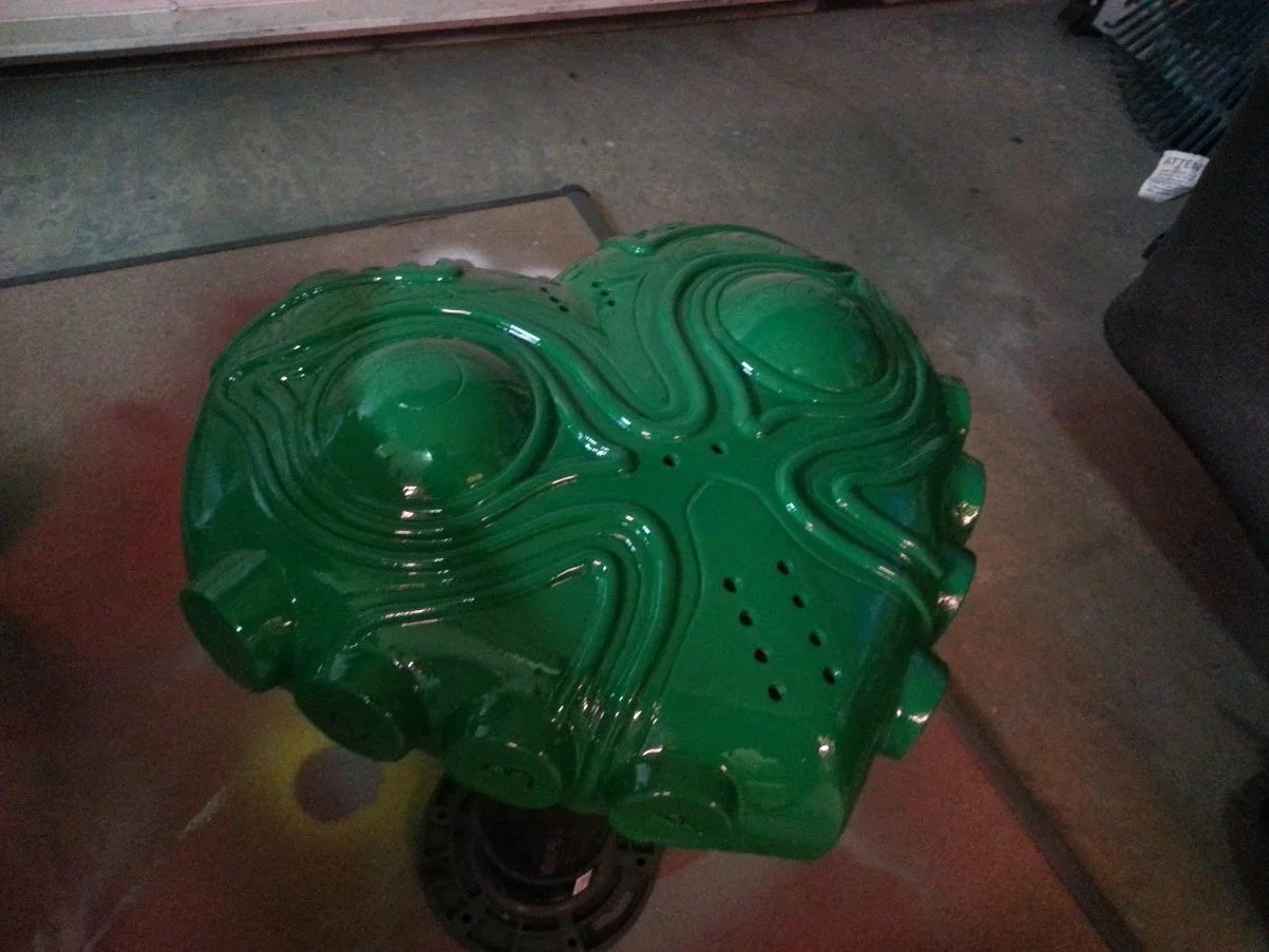 A brush-on silicone mold was created using Smooth-On Rebound 40, built up in multiple layers for strength. Silicone registration keys were added to the outside of the mold, and after applying release agent, rigid expanding Foam-iT was used to create a hard support shell. The mask shells were cast in Smooth-Cast 65D resin using a rotational casting process. Each casting was tinted for inventory tracking before final paint.