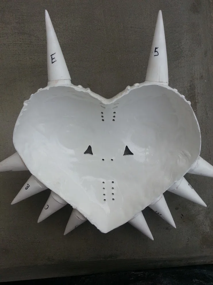 The rounded eye forms were created using the tops of old large Pokéballs. The black line details were built using Apoxie Sculpt, pushed through an extruder with a half-circle attachment. A separate Pepakura template was printed and used as a placement guide to keep the lines consistent. The embossed sections were engraved using a Dremel rotary tool. Additional Bondo work followed.