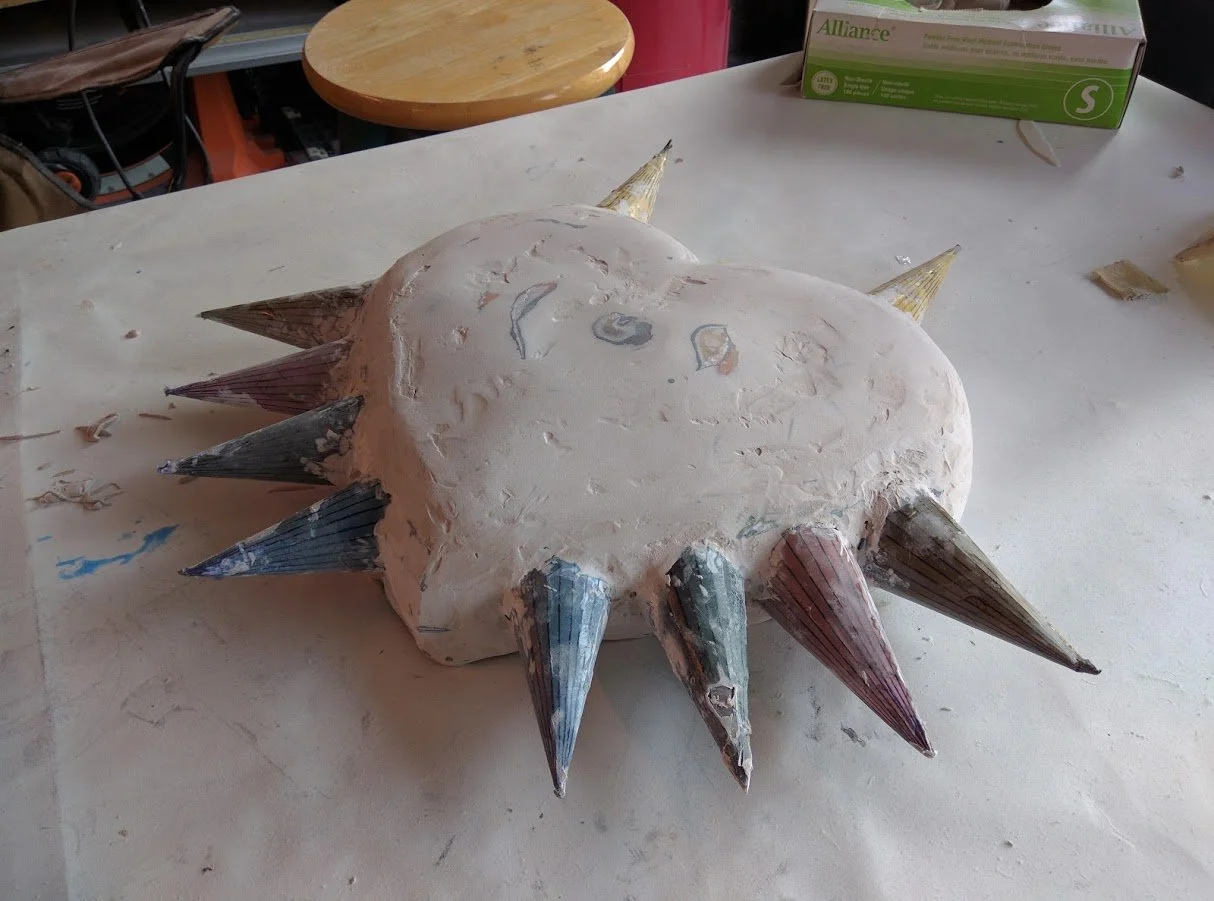 The mask was printed on 110 lb cardstock, then cut, folded, and assembled using the Pepakura method. Several coats of fiberglass resin were brushed onto the paper model to add strength for the next stages of reinforcement and surface work. Bondo body filler was applied to build thickness, since the intention was to mold the back of the mask. The surface was refined through multiple sanding passes to achieve a smooth finish.