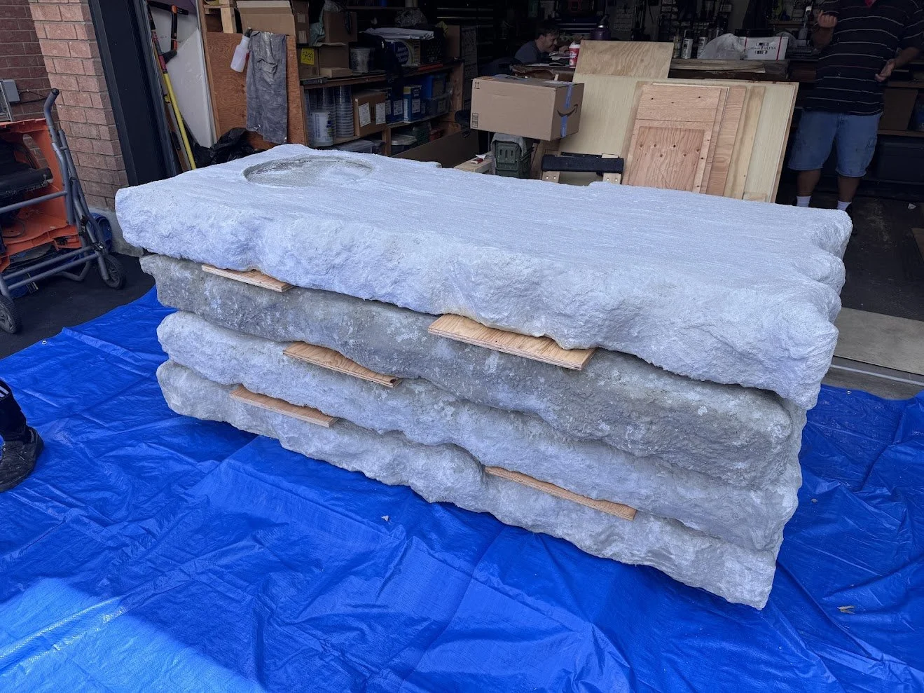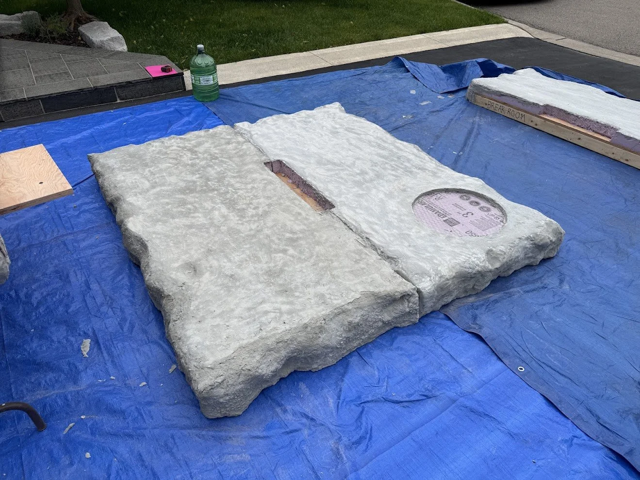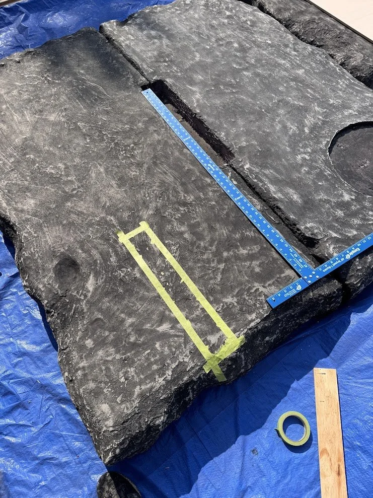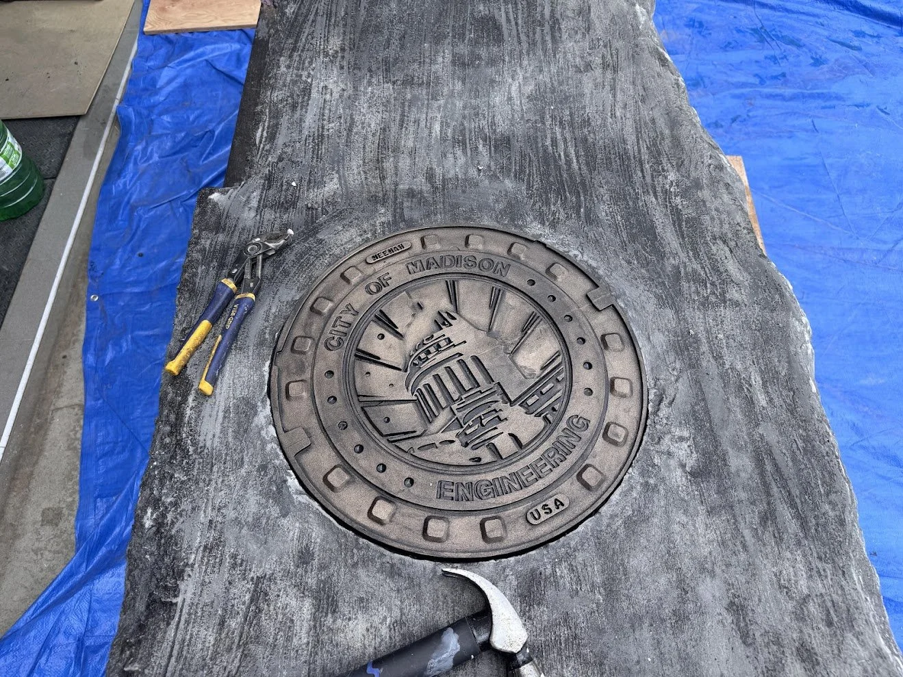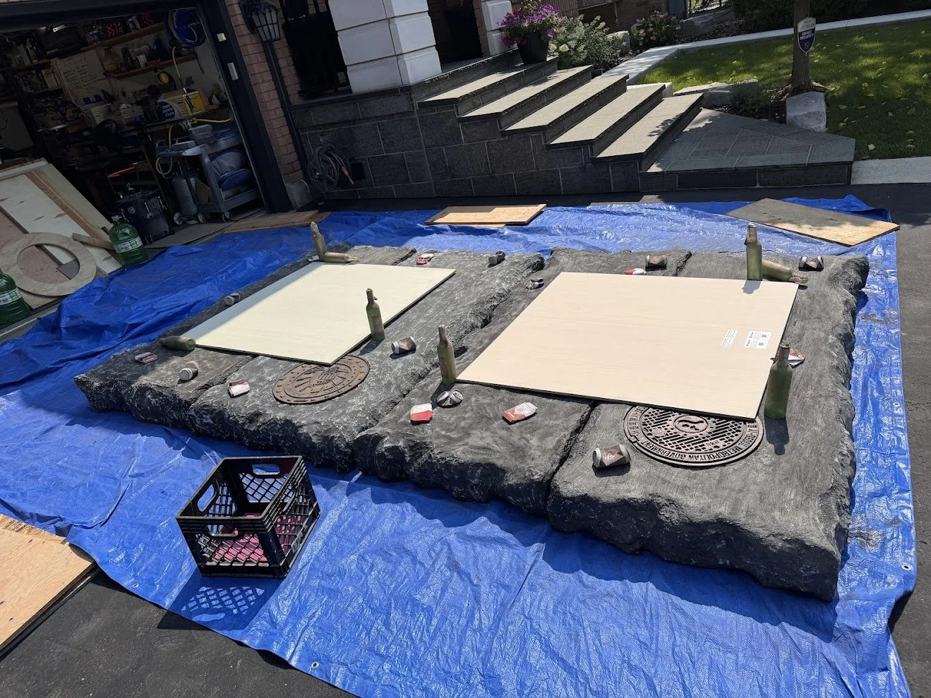 The bases featured a wide range of custom details, including manhole covers, energy drink spills, lane markers, cigarette packs, and Molotov cocktail props. Each base was built from plywood with XPS foam secured around the edges, carved to shape, and reinforced with metal mesh. This provided the grip and strength needed for a vertical concrete mix, which was hand-applied and shaded using multiple techniques for realism.