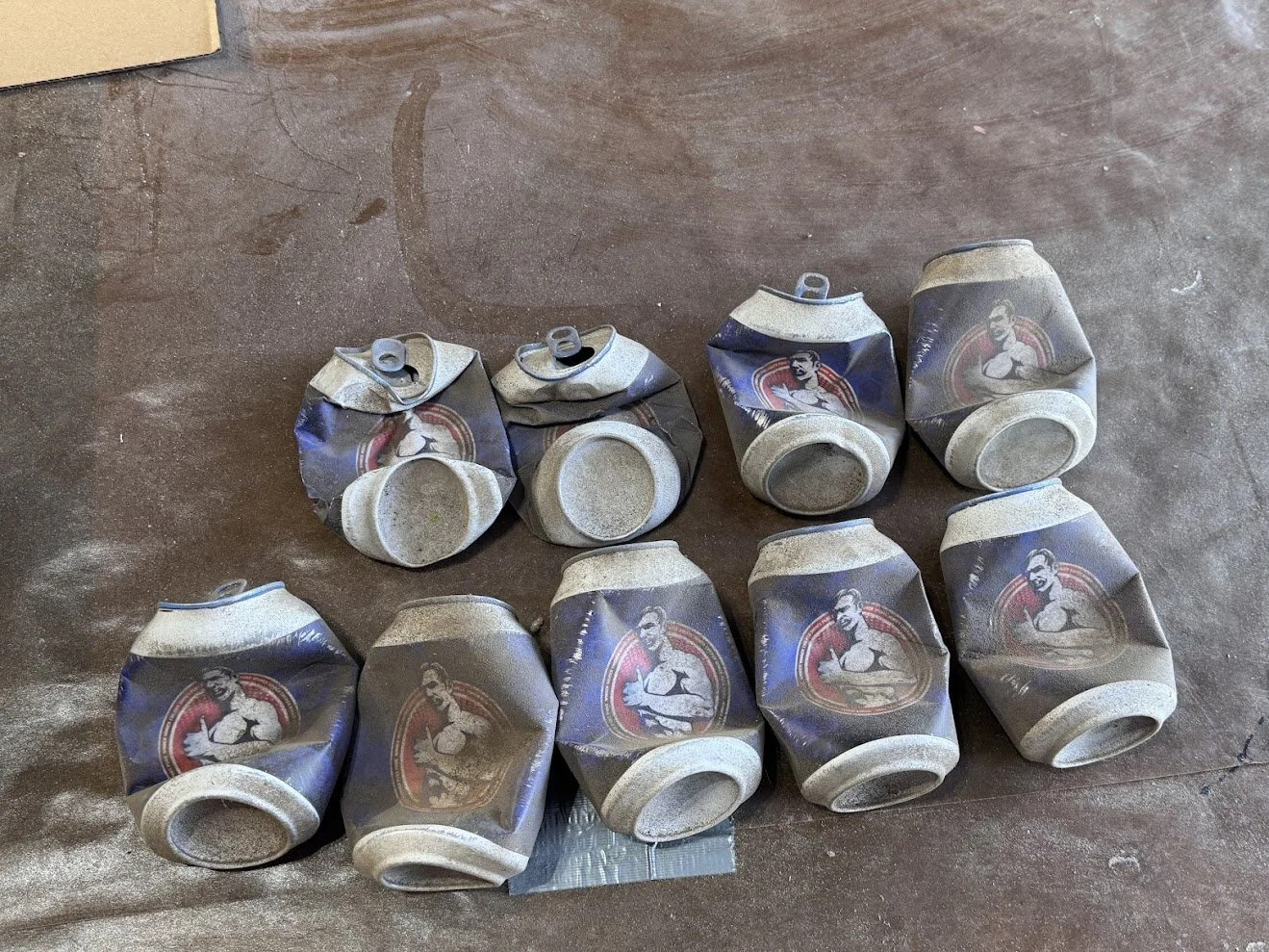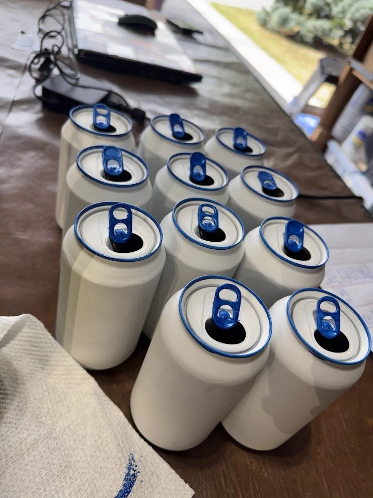 Energy drink cans were produced similarly to a previous project. Carbonated water cans were sanded, painted flat white, and finished with metallic blue rims and tabs. Custom vinyl labels were designed and applied to replicate the iconic in-game items.