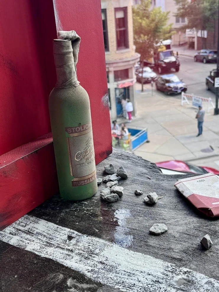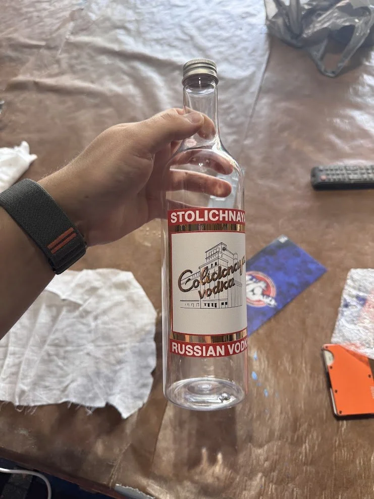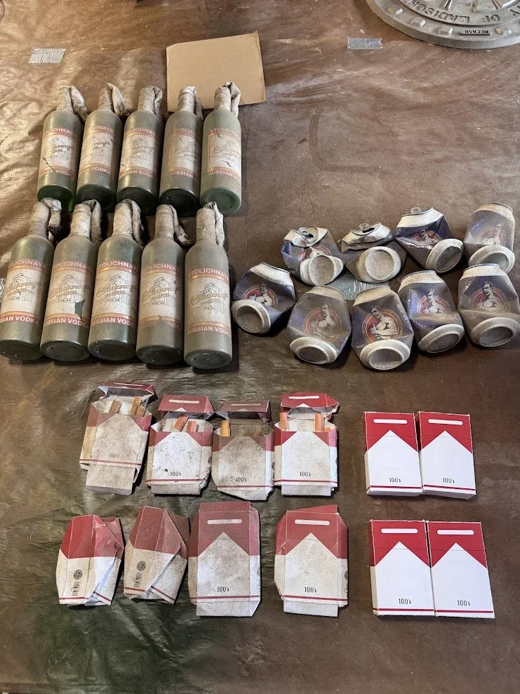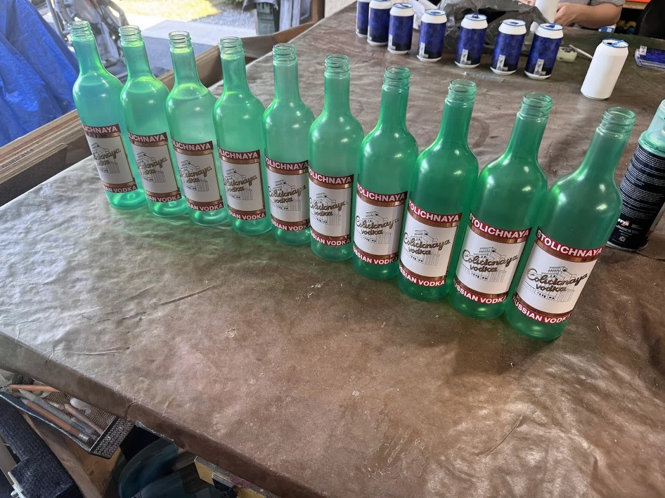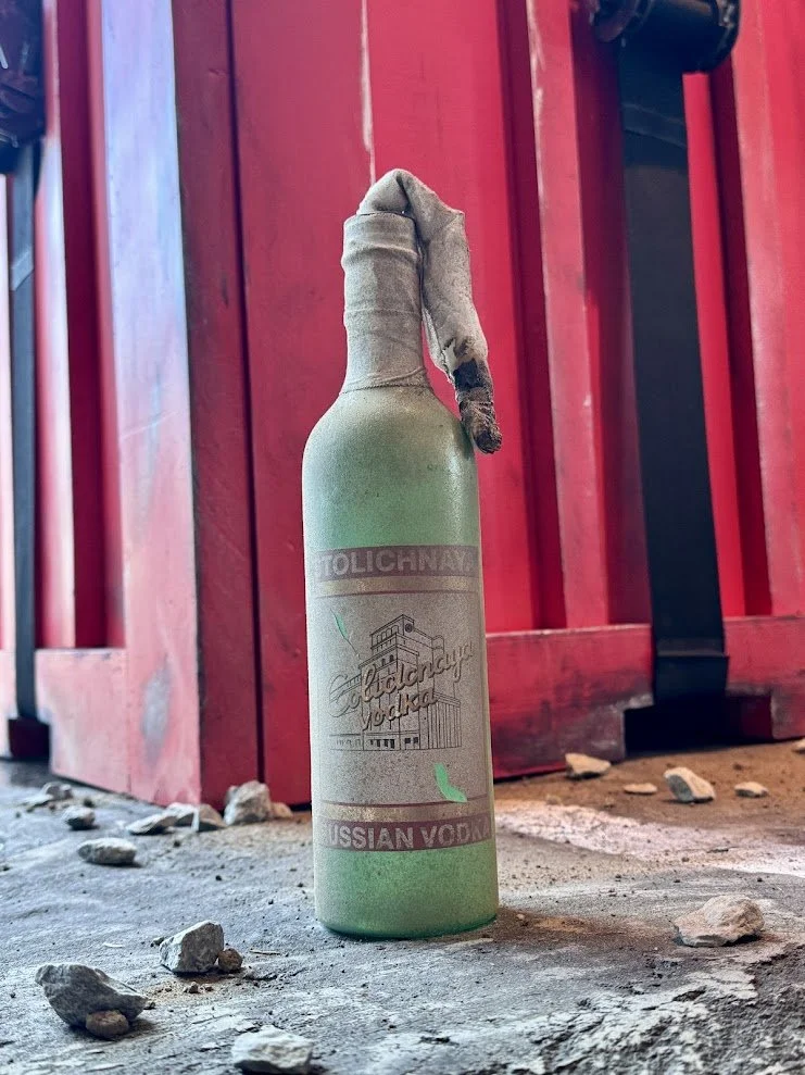 Molotov props were made from plastic wine bottles, sealed and painted green with brown shading, then coated in spray adhesive and dirt. Custom labels with gold foil inlays were designed to match the in-game look, adding a premium detail that was not required but highly appreciated by the client. The Molotovs were made without liquid to ensure safety over time.
