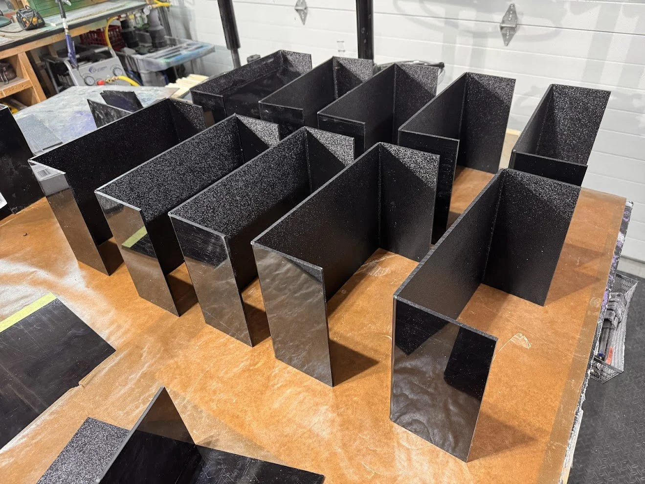 The units were constructed primarily from 4.5 mm black ABS plastic sheets. Each component was CNC cut to size and bent using an acrylic plastic heat machine, which allowed for clean, uniform bends with predictable angles.