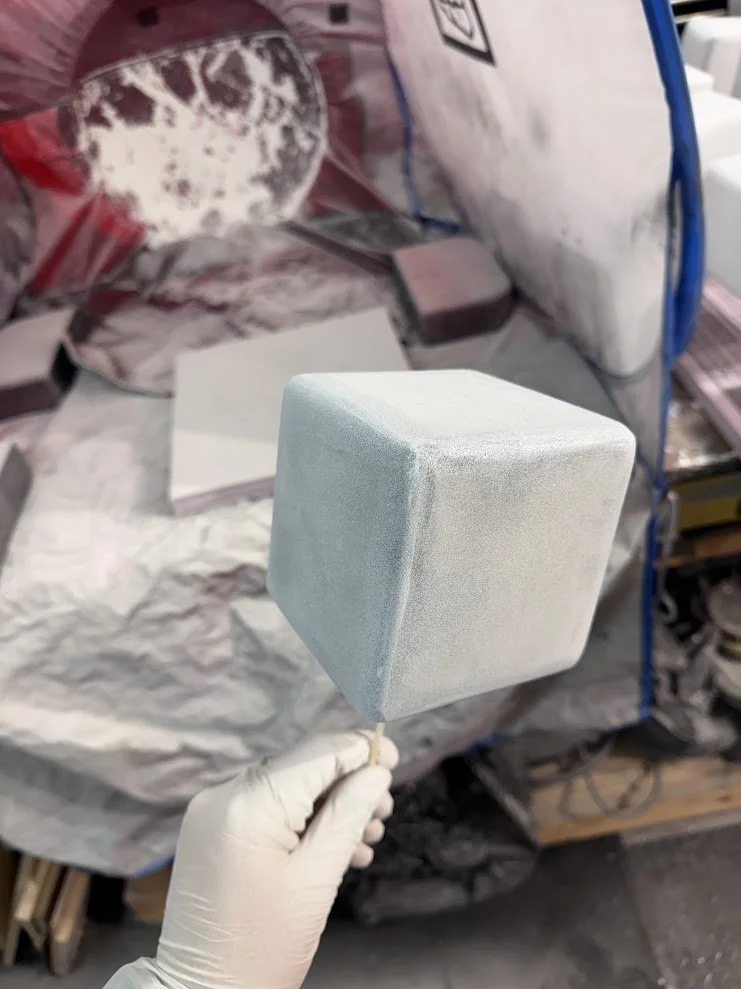 For finishing, the cubes were coated with Plasti Dip as a primer using several light coats. This was followed by multiple light coats of Maker Pro Paint mixed with a flex additive, sprayed through an HVLP gun to achieve a smooth, durable finish.