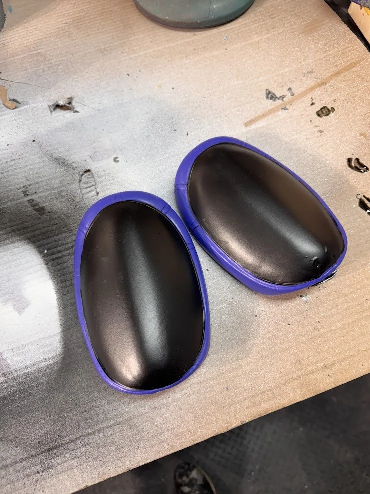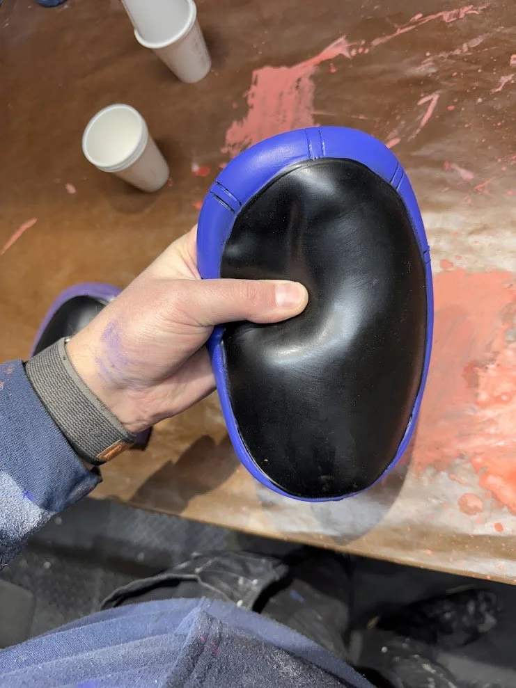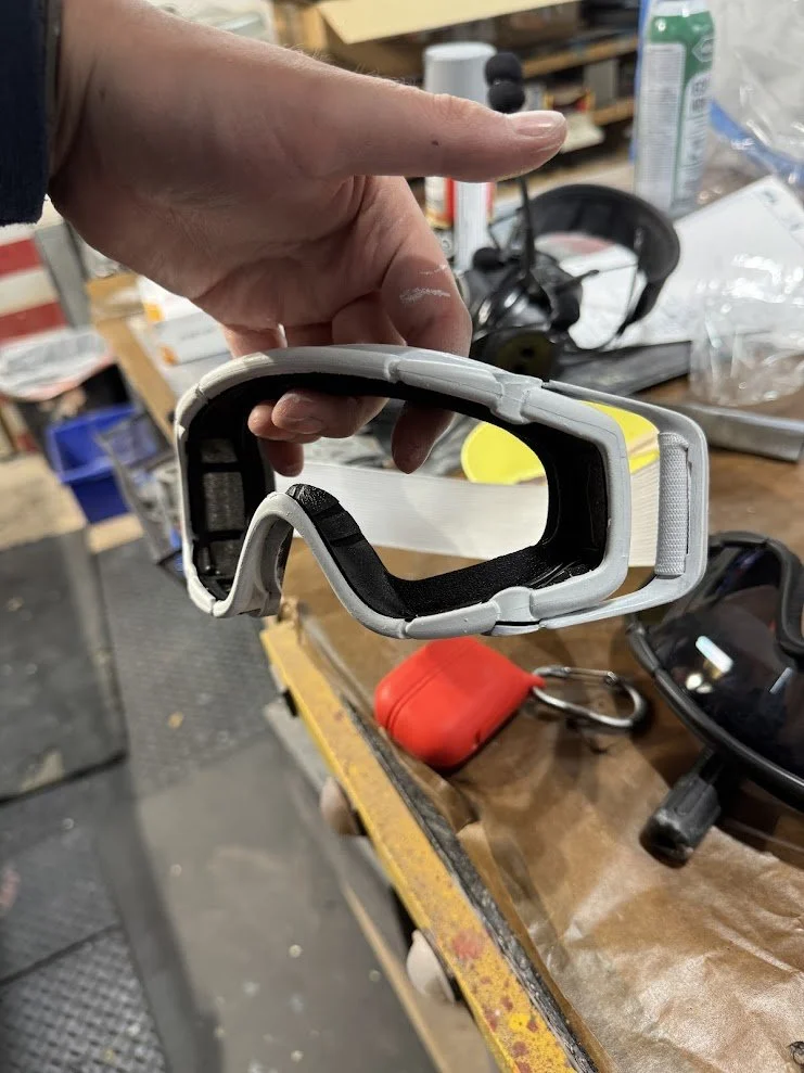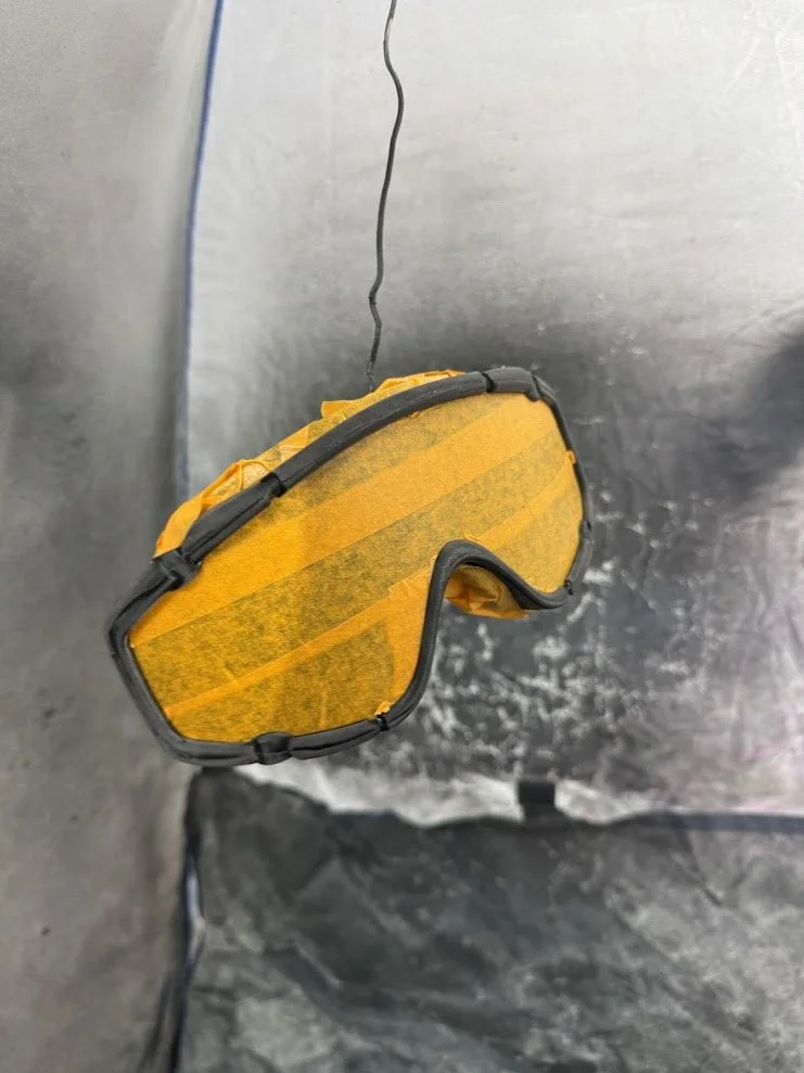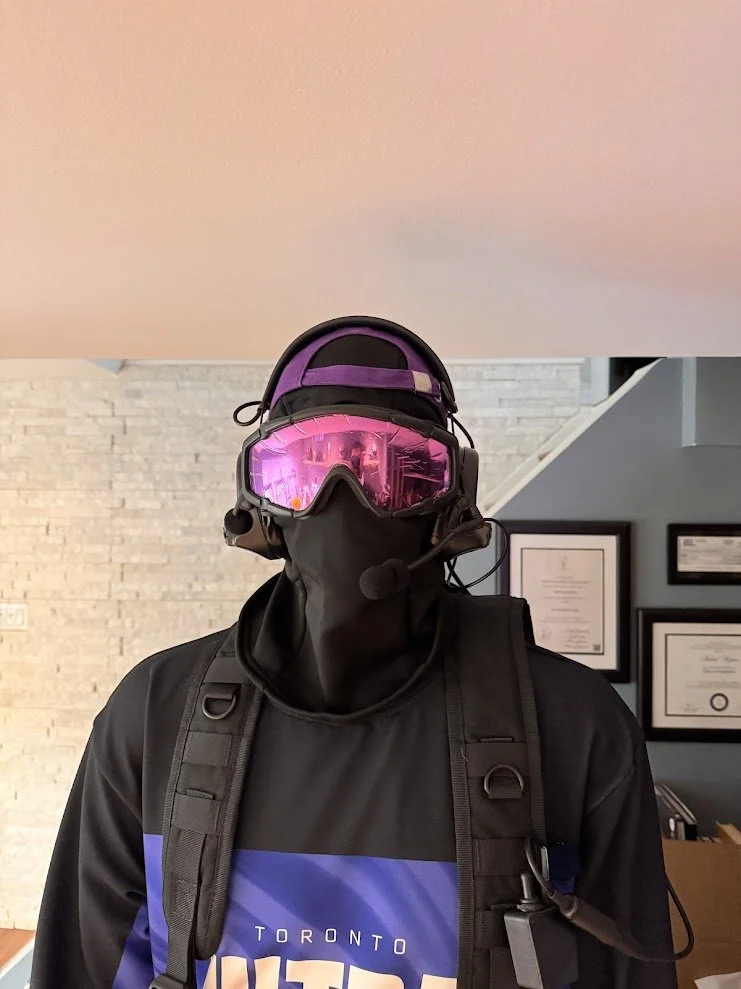 Some elements were built entirely from scratch. For example, the knee pads were designed in 3D, printed, molded in silicone, and cast in flexible foam rubber to allow actors full mobility. The goggle frames were custom painted, and the lenses were cut from tinted window film. After initial tests produced a pink tone that was too light, we refined it to a deep purple that matched the in-game reference. Jerseys were designed and sublimation printed onto crew neck sweaters, and the headphones were hollowed out so that actors could wear them comfortably while still being able to hear their surroundings.