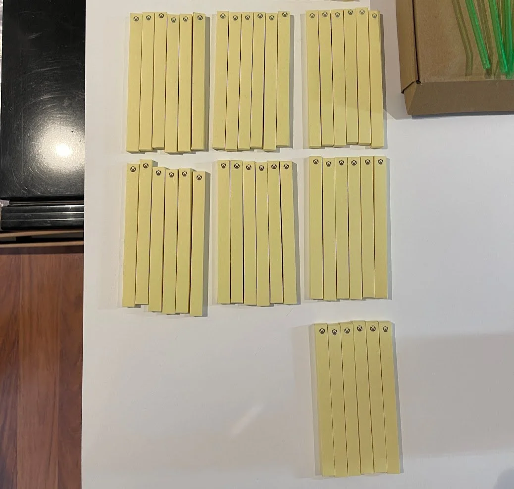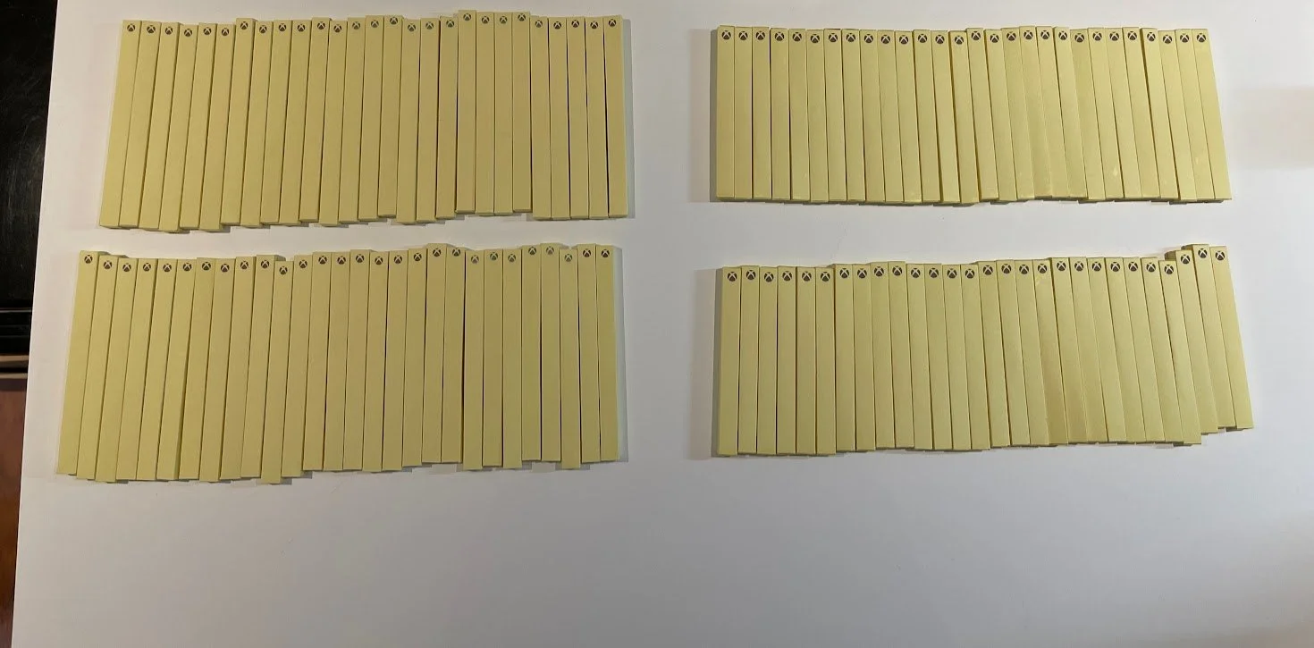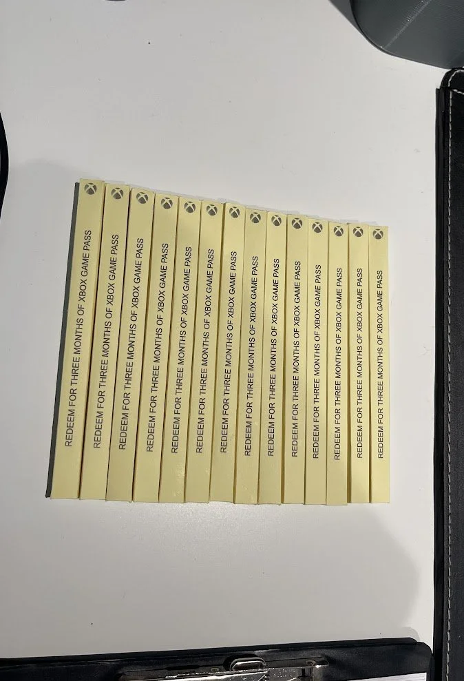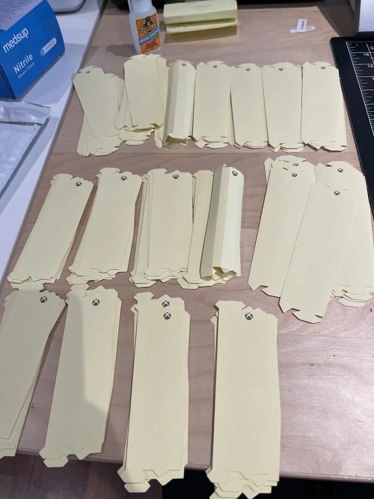 In total, we made 150 paper French fry props, complete with custom printing. Some of the fries even included Xbox Game Pass membership codes hidden inside. Each fry was 3D modeled, unfolded into Pepakura templates, and printed on heavy yellow cardstock featuring Xbox logos and branding. We used a vinyl cutter for precision cutting, then hand-folded each one into shape.